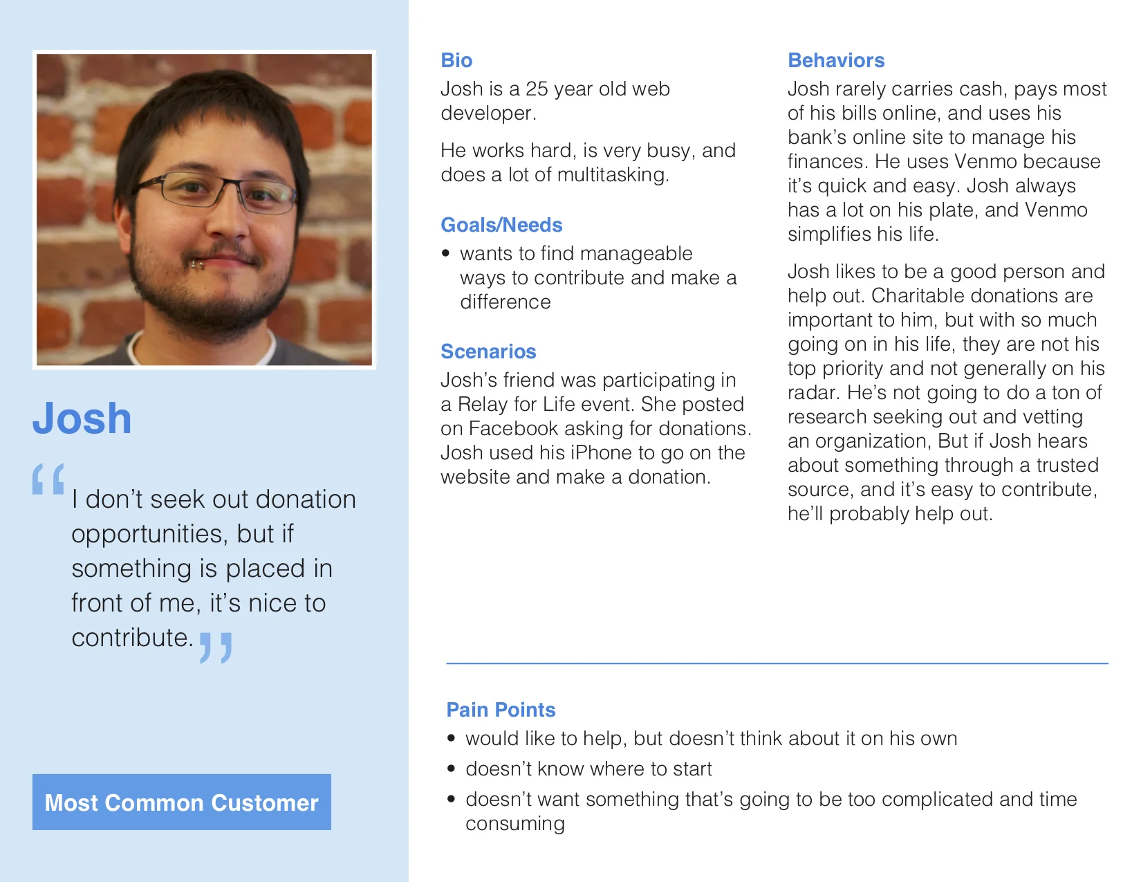 Created a survey to learn about people's donations habits, sent a follow-up survey going in depth on user donation habits and pain points. Affinity maps were then based on user surveys and Interviews.